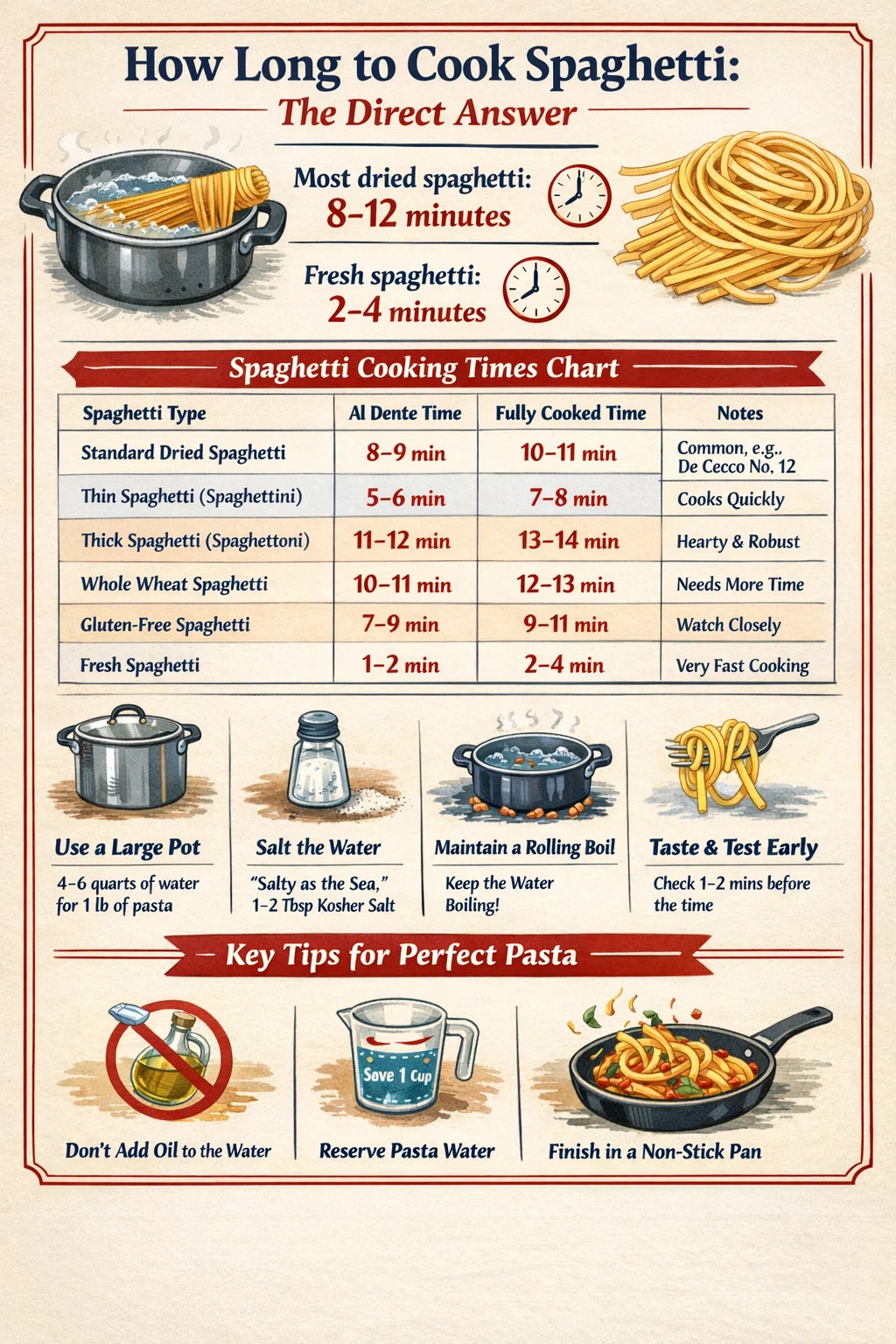 | Standart kurutulmuş spagetti | 8–9 dakika | 10–11 dakika | En yaygın olanı; örneğin, De Cecco No. 12 |