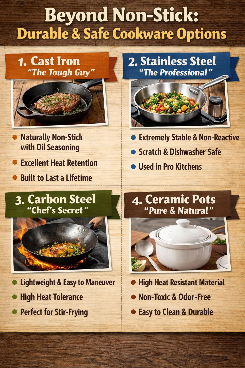 Modern iken yapışmaz tencere normal kullanımda güvenlidir; kaplama pullanması veya yüksek sıcaklık sorunlarıyla ilgili endişeleriniz olmayan, tamamen endişesiz bir pişirme kabı arıyorsanız, gerçekten çok daha sağlam ve güvenilir alternatifler var.