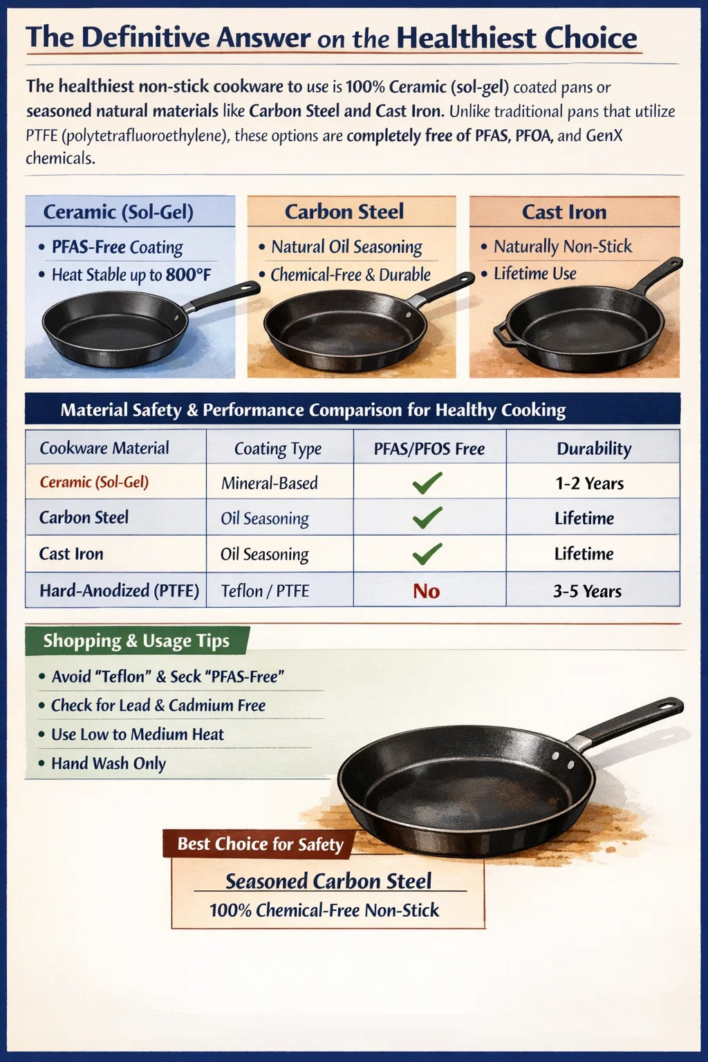 En sağlıklı yapışmaz tencere kullanmak %100 Seramik (sol-jel) kaplı tavalar veya Karbon Çelik ve Dökme Demir gibi işlenmiş doğal malzemeler . PTFE (politetrafloroetilen) kullanan geleneksel tavaların aksine, bu seçenekler tamamen PFAS, PFOA ve GenX kimyasallarından arındırılmıştır. Kavurucu sıcaklıklarda bile sıfır kimyasal riskiyle mutlak en güvenli profili arayanlar için, tecrübeli Karbon Çelik Yalnızca ısı ve polimerize bitkisel yağ kullanarak fiziksel yapışmaz bir bariyer oluşturduğu için ilk tercih olarak öne çıkıyor.