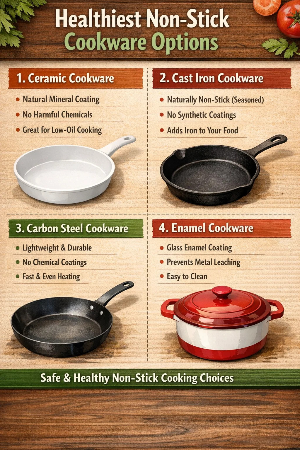 Aşağıda, yaygın olarak en sağlıklı olarak kabul edilen çeşitli yapışmaz pişirme kabı türlerine ilişkin ayrıntılı bir giriş bulunmaktadır: